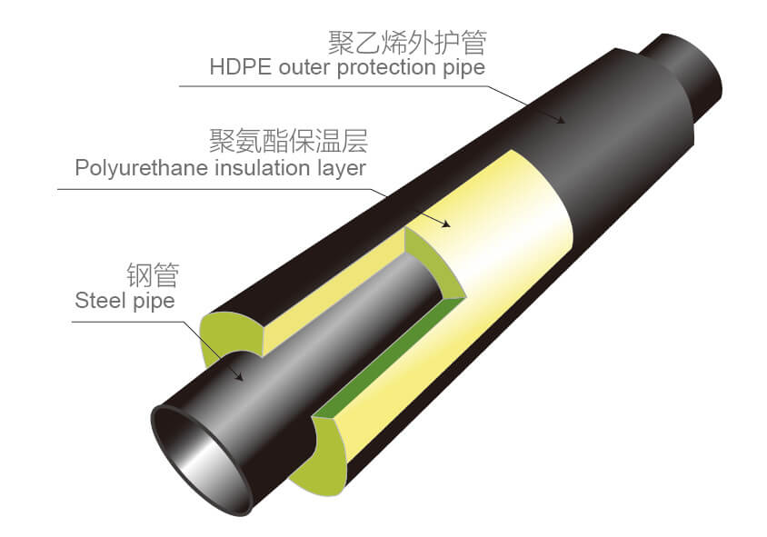 直埋預(yù)制保溫管是由輸送介質(zhì)的鋼管,高密度聚乙烯外護管,以及鋼管和外套管之間的聚氨酯硬質(zhì)泡沫塑料保溫層緊密結(jié)合而成。它的結(jié)構(gòu)設(shè)計合理,滾動摩擦力小,固定支座受力減小,其力學(xué)分析原理簡單,管道穩(wěn)定性、安全性得到較大提高。解決了空氣層結(jié)構(gòu)存在的每隔50-60m,必須設(shè)置一對排潮管的問題,極大地降低了外套管的破損率,使管道沿線更加美觀。同時,降低了由于設(shè)置排潮管而增加的造價。
